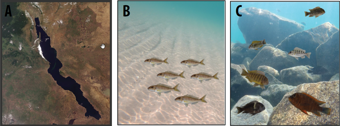 Fig. 1: Satellite view of Lake Tanganyika, East Africa (A), cichlid diversity in the sand and in the rocky littoral zone (B-C).